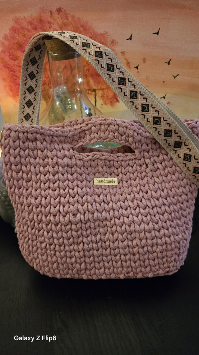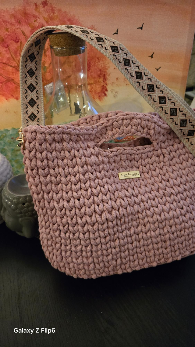 Sac à main en crochet rose avec sangle beige ,avec des dessins géométrique.